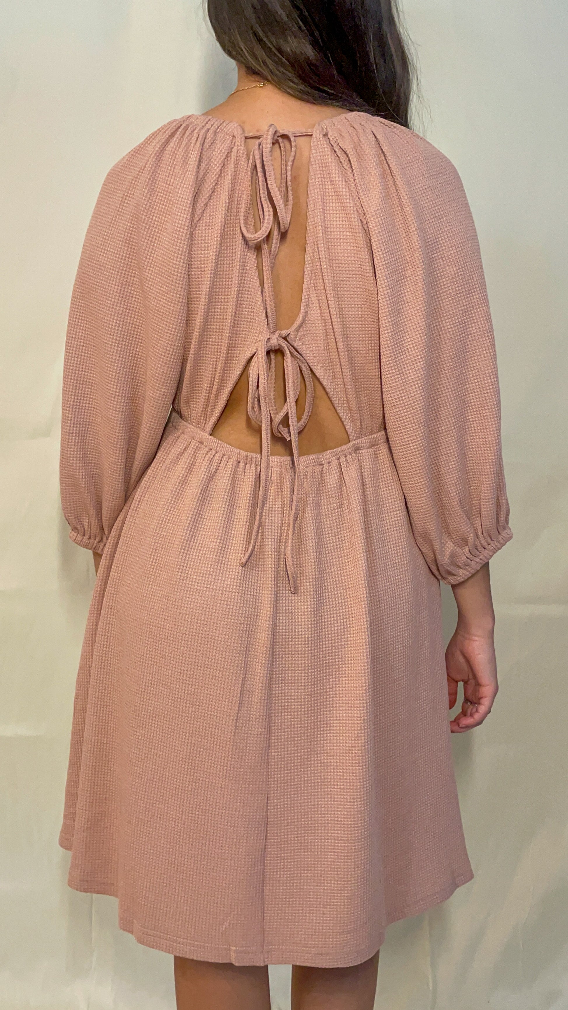 Pink knit, v neck dress, balloon sleeves, with an open back, and side pocket.